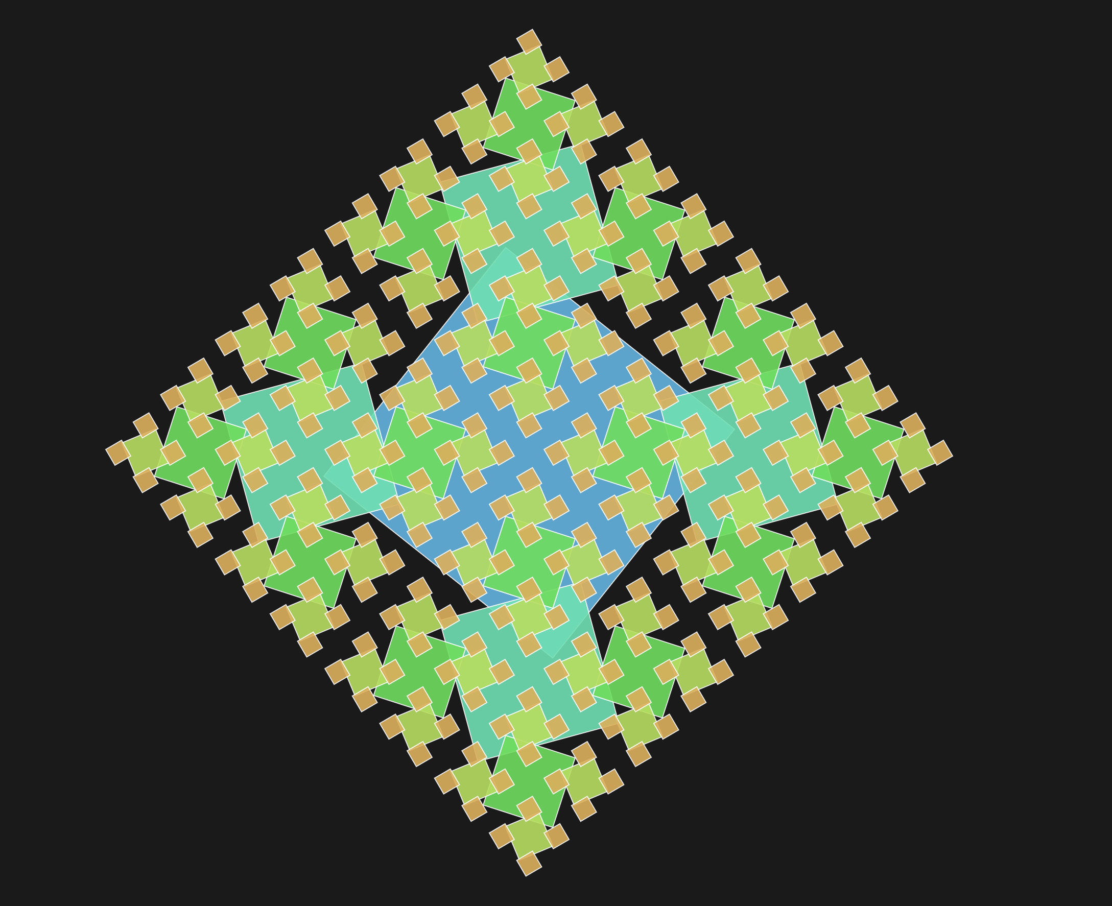 XSLT 側では4つの四角を call-template で生成するところから開始して、再帰でフラクタル状に四角をつくっていく。