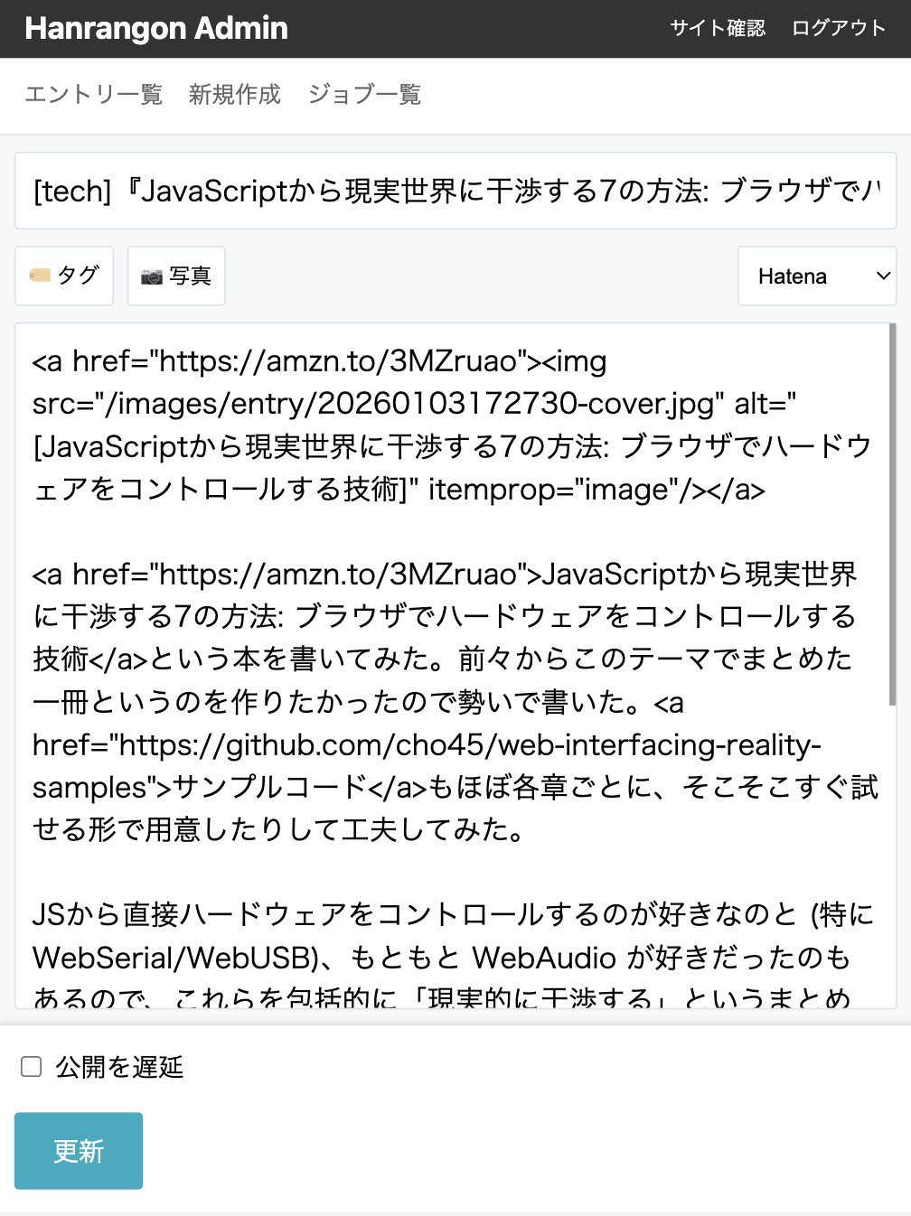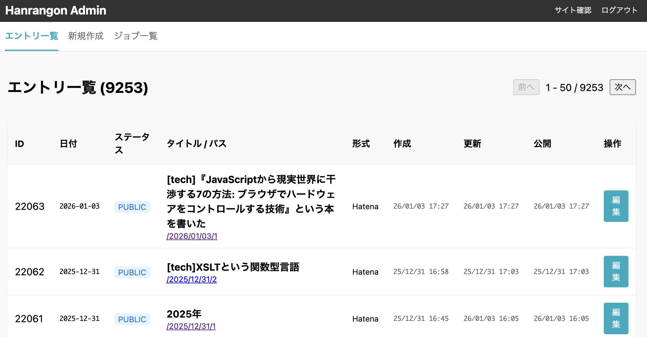 自分しか使わない管理画面をリッチに作る気がさらさら起きなかったので、今までは1つの「編集」画面しかなかった。十分といえば十分だけど予約投稿機能が実はあるので、それを管理するのが面倒なのと、ジョブキューの見える化をしたかったので、新しく作った。