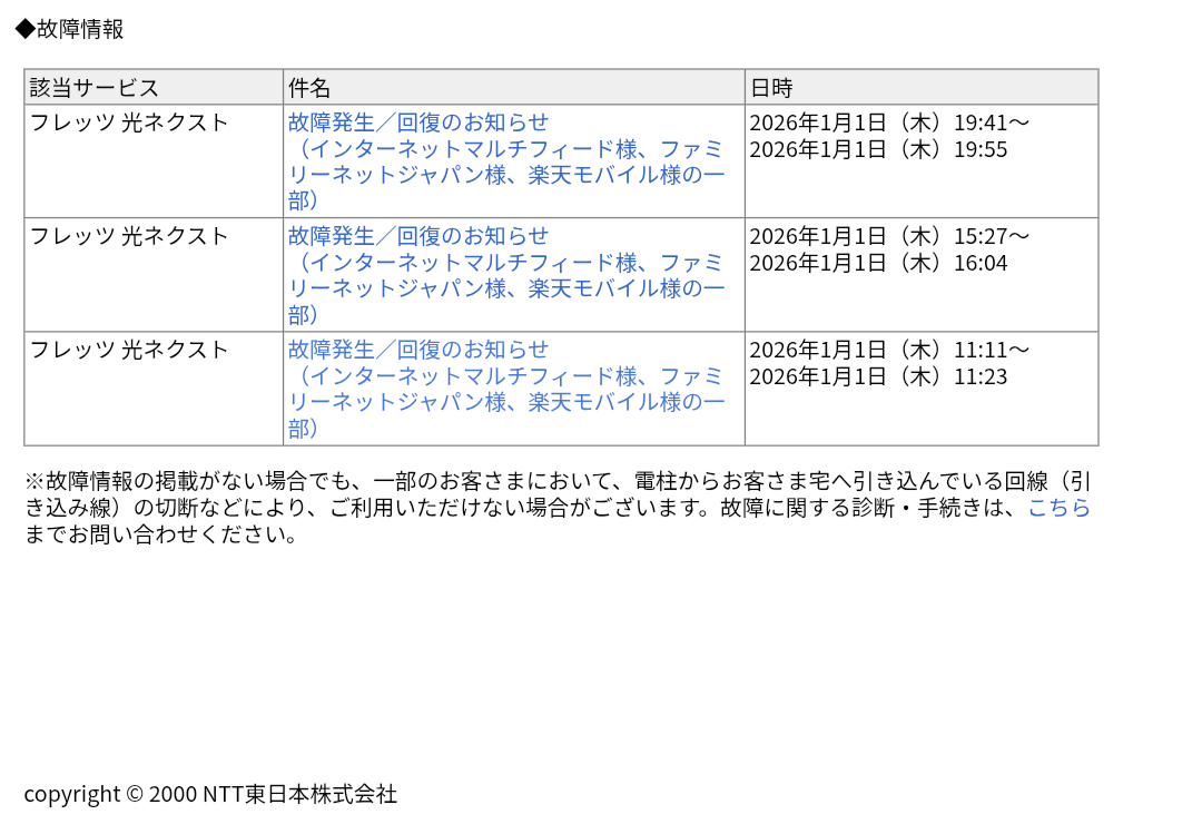 問合せ方法とかを調べていたら自動的に復旧したので良かった、と思いきやまた数分切断とかとなって嫌な感じだった。結局 NTT 側の障害だった (結構この障害情報も遅れて表示されるので、当日の夜にようやく原因がわかった)