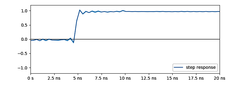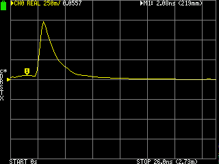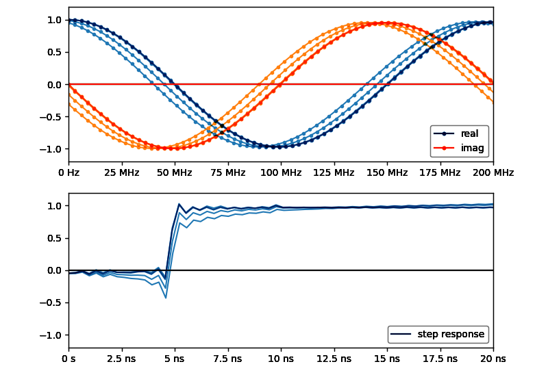 以下の3つのグラフは上から「DC付近の拡大 (周波数ドメイン)」「DC〜200MHzまで切り取り (周波数ドメイン)」「IFFT して積分したステップ応答(時間ドメイン)」