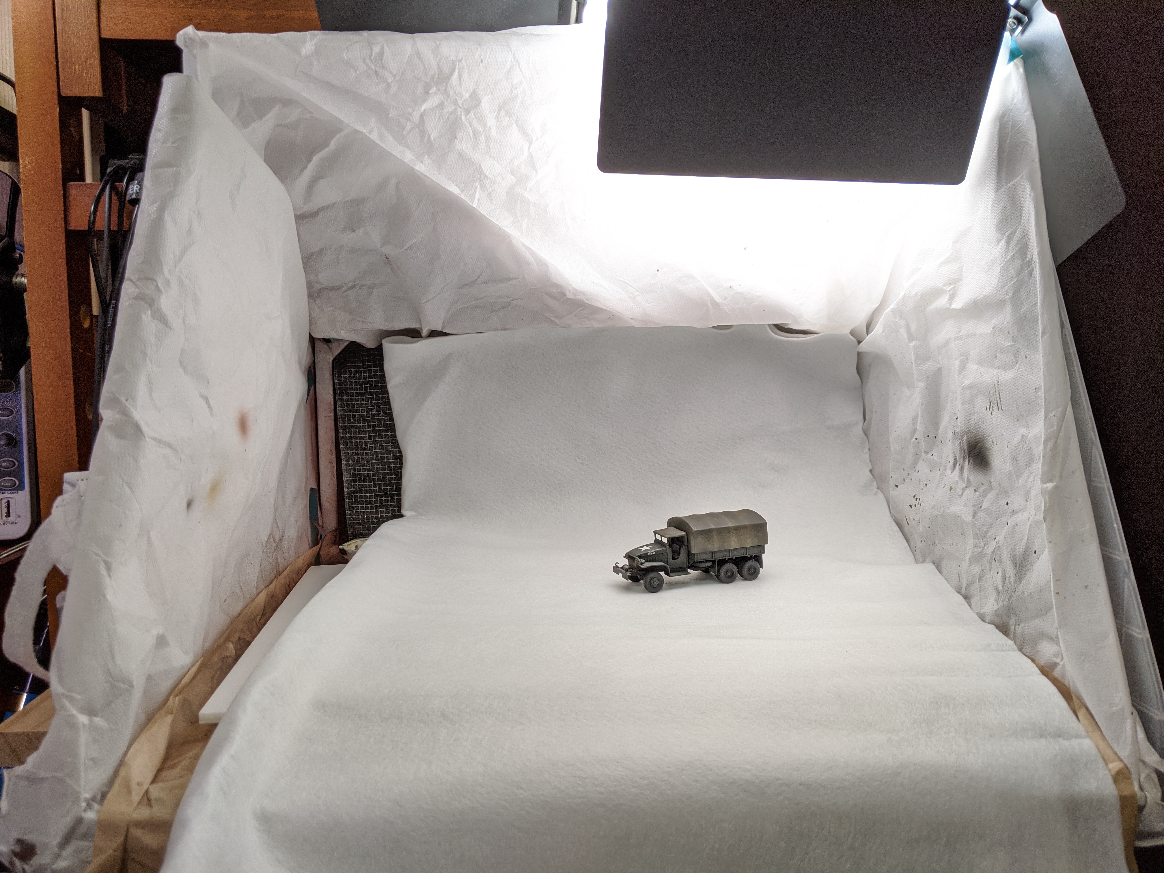 安い塗装ブース、フル回転させるとうるさすぎるので、ステップダウンコンバーターをつけて電圧可変できるようにした。プラダンで排気用のダクトを保持するようにして、使うときだけ窓枠に挟んでる。