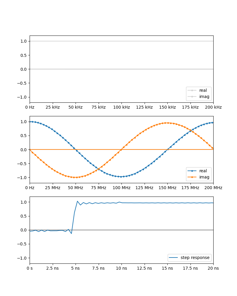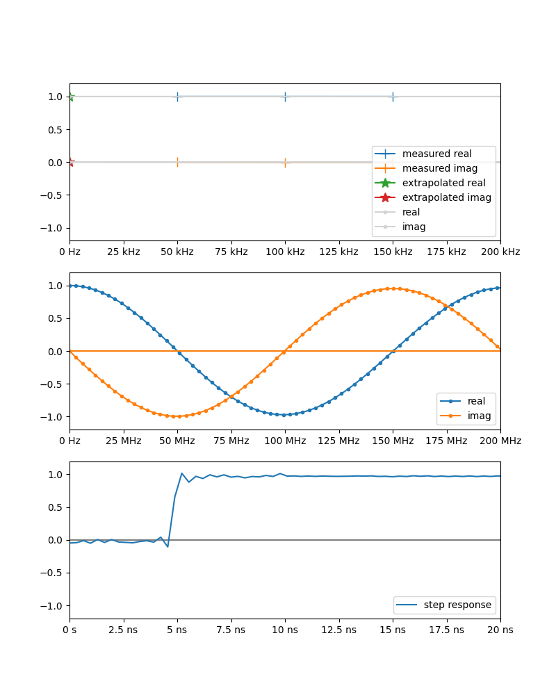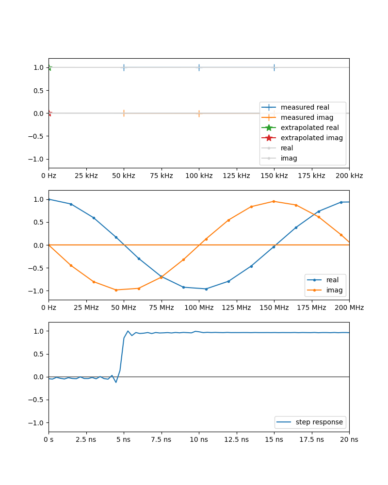 以下の3つのグラフは上から「DC付近の拡大 (周波数ドメイン)」「DC〜200MHzまで切り取り (周波数ドメイン)」「IFFT して積分したステップ応答(時間ドメイン)」