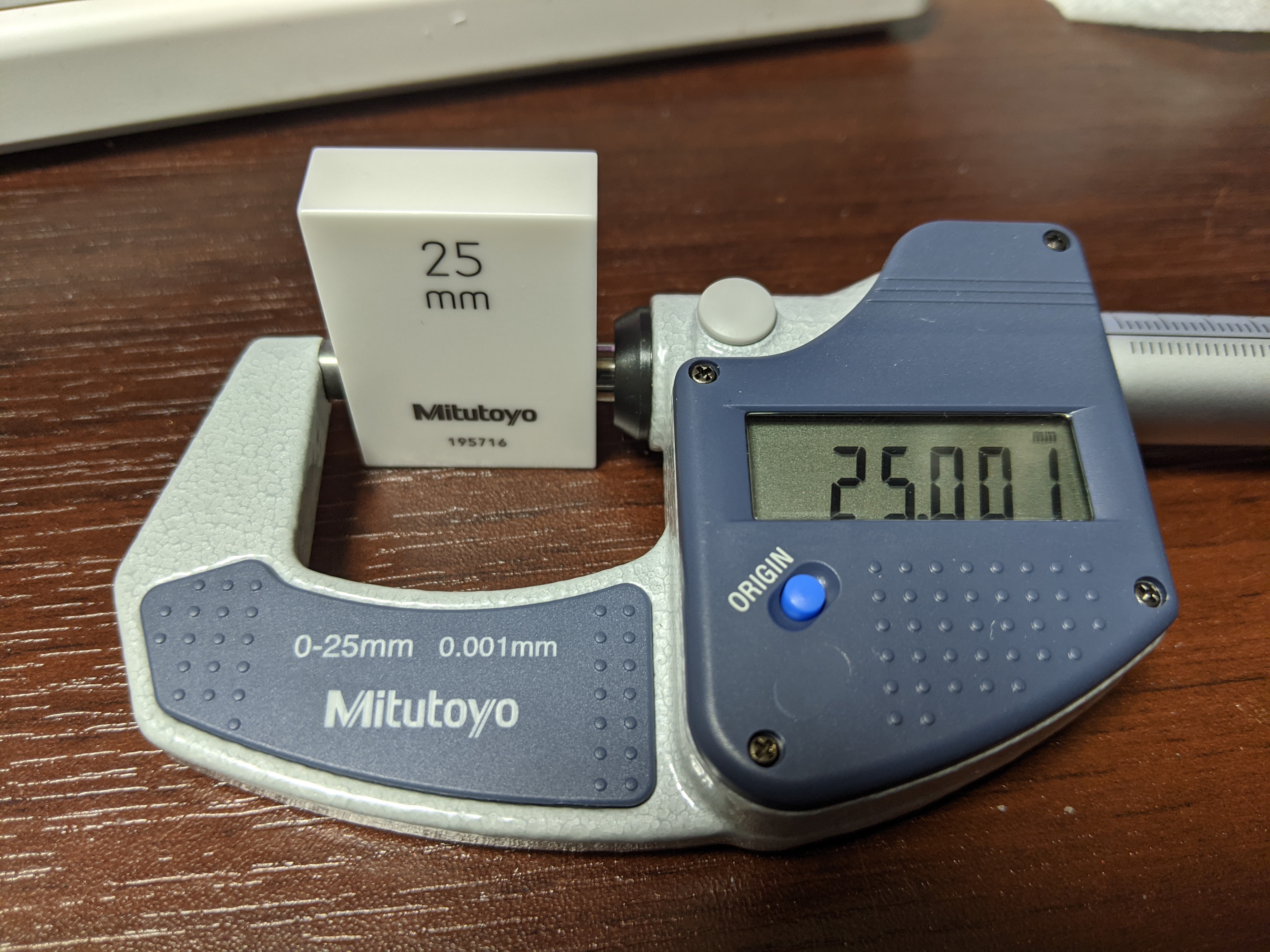 マイクロメータの検査に使える。このマイクロメータは出荷時検査で 25mm のとき +1μm なので、これであってる (マイクロメータ側の誤差)。
