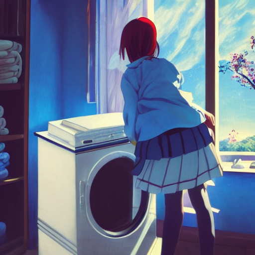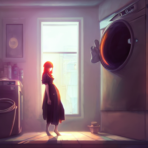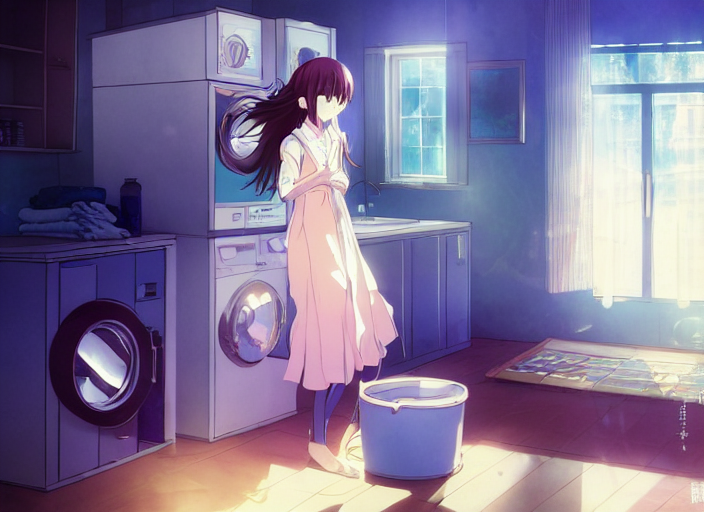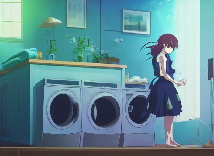 洗濯機抜きにして、最近流行ってる風の雰囲気の良い環境と女の子を描いてもらおうとしたがむずかしく、結局顔のクローズアップになってしまう。雰囲気はとてもいい