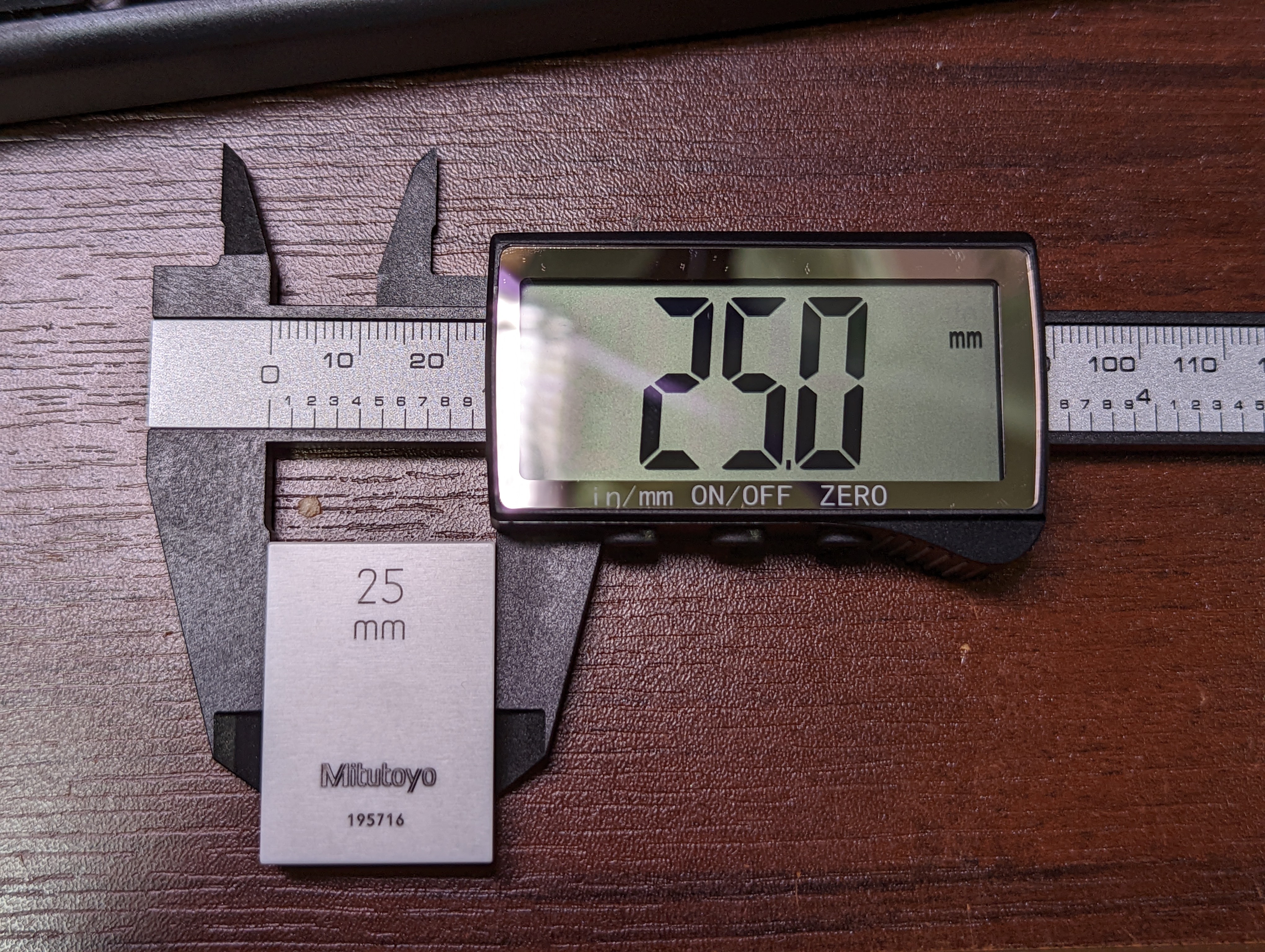 800円弱ぐらいで買えてしまうカーボンノギス。スペック上は器差±0.2mm、表示上は0.1mm。安いアナログノギスの変わりには十分だろう。