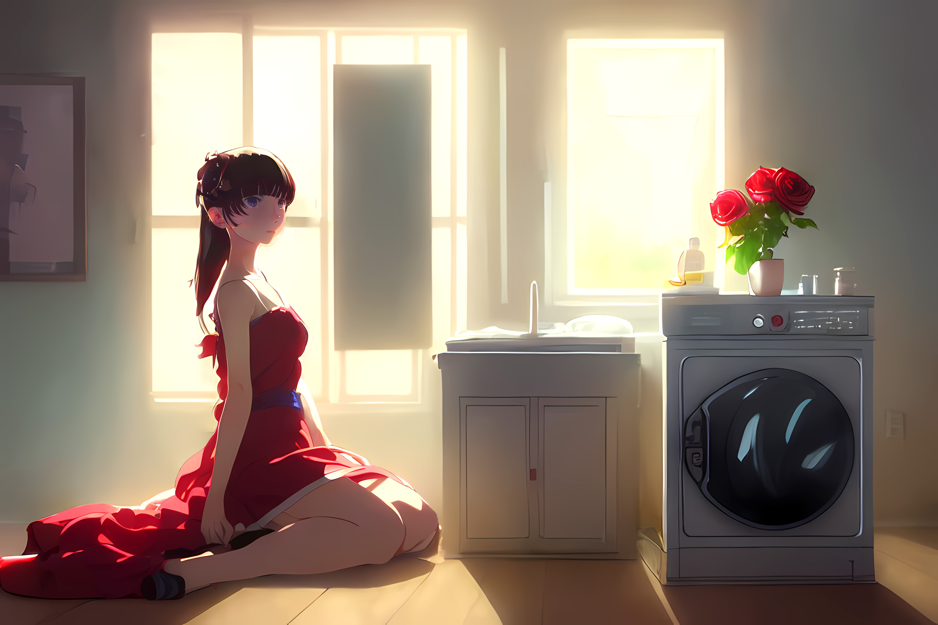 洗濯機。前も書いたけど学習データにないような洗濯機+女の子を描いてもらおうとすると著しく打率が低下する。洗濯機そのものが描かれにくいのもそうだけど人物のクオリティも下がる。