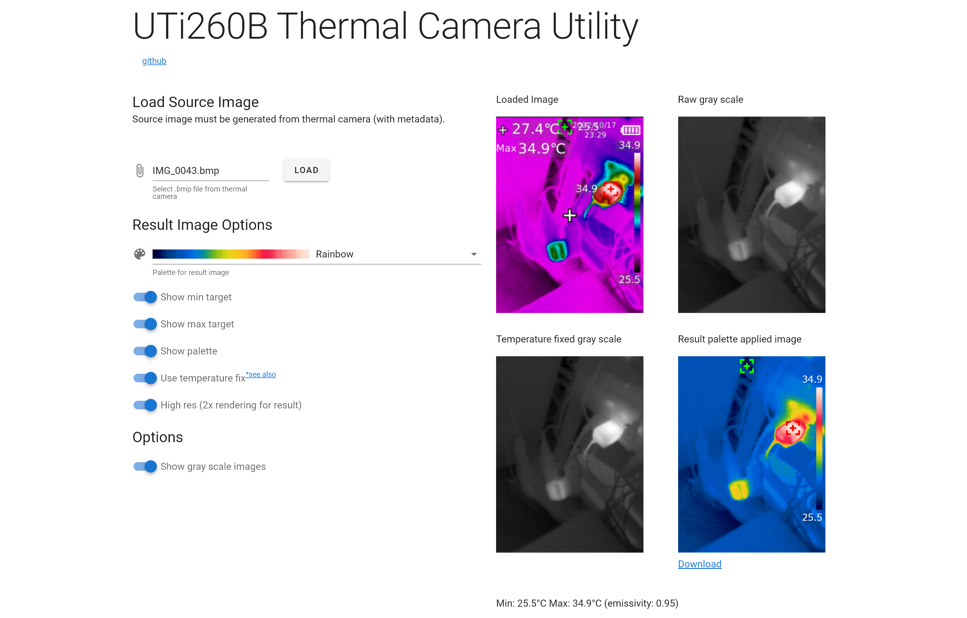 カラーパレットと最大・最小温度のマークを表示する機能もつけてある。