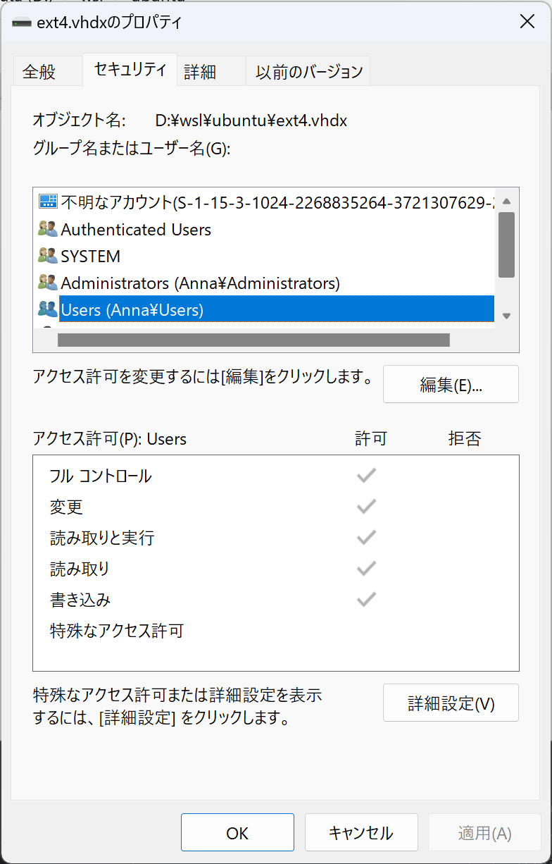 ただ、管理者権限だと起動できる。該当する .vhdx ファイルのプロパティのセキュリティタブを見てみると変更権限などが一般ユーザになかったため追加したらうまくいった。