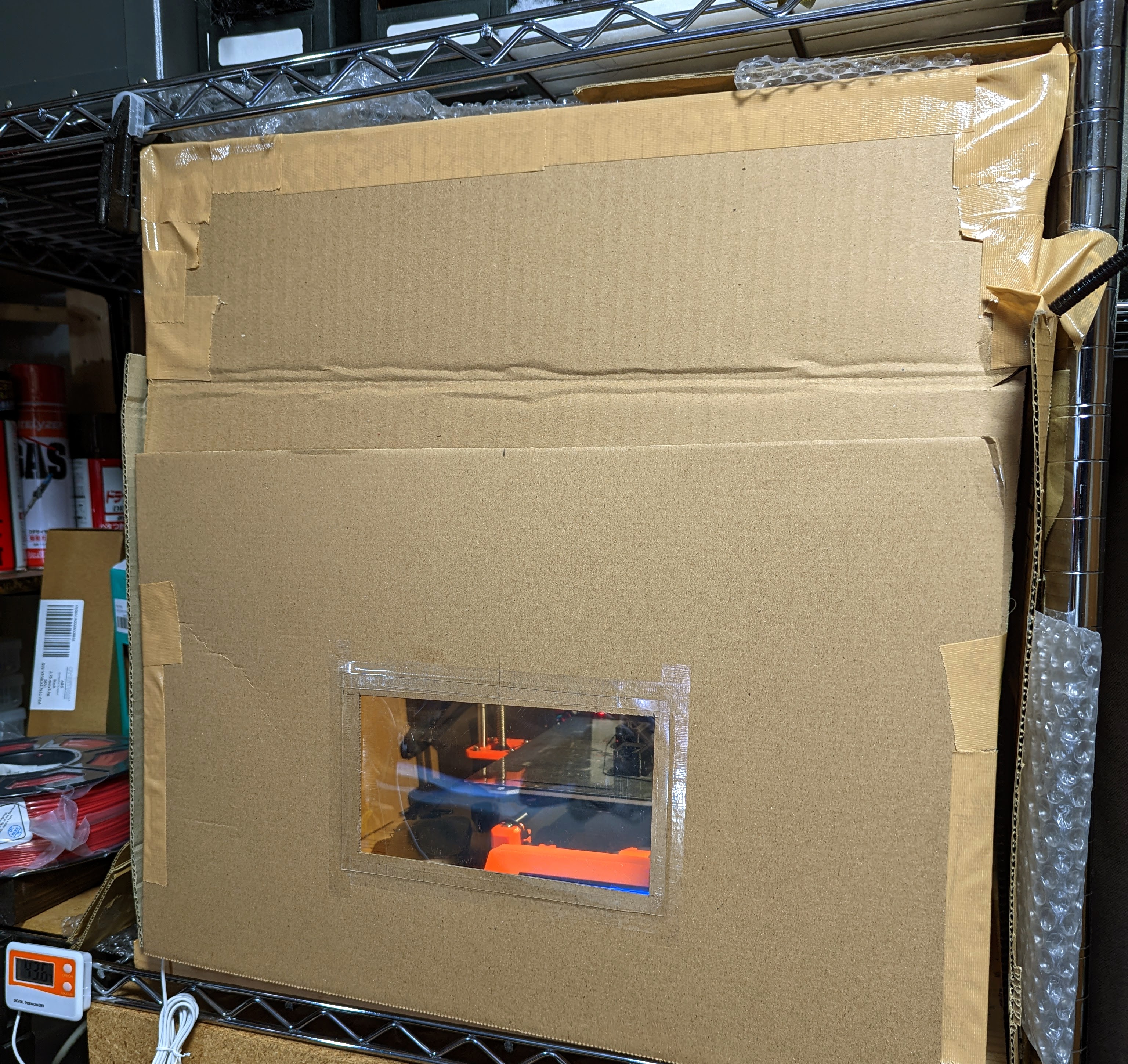 だいぶ前に Original Prusa i3 にかぶせていたエンクロージャはABSをプリントしないこととなかなか邪魔なこともあって捨ててしまったので、一時的にということでダンボールで箱をつくった。これで内部は40~50℃ぐらいになる。