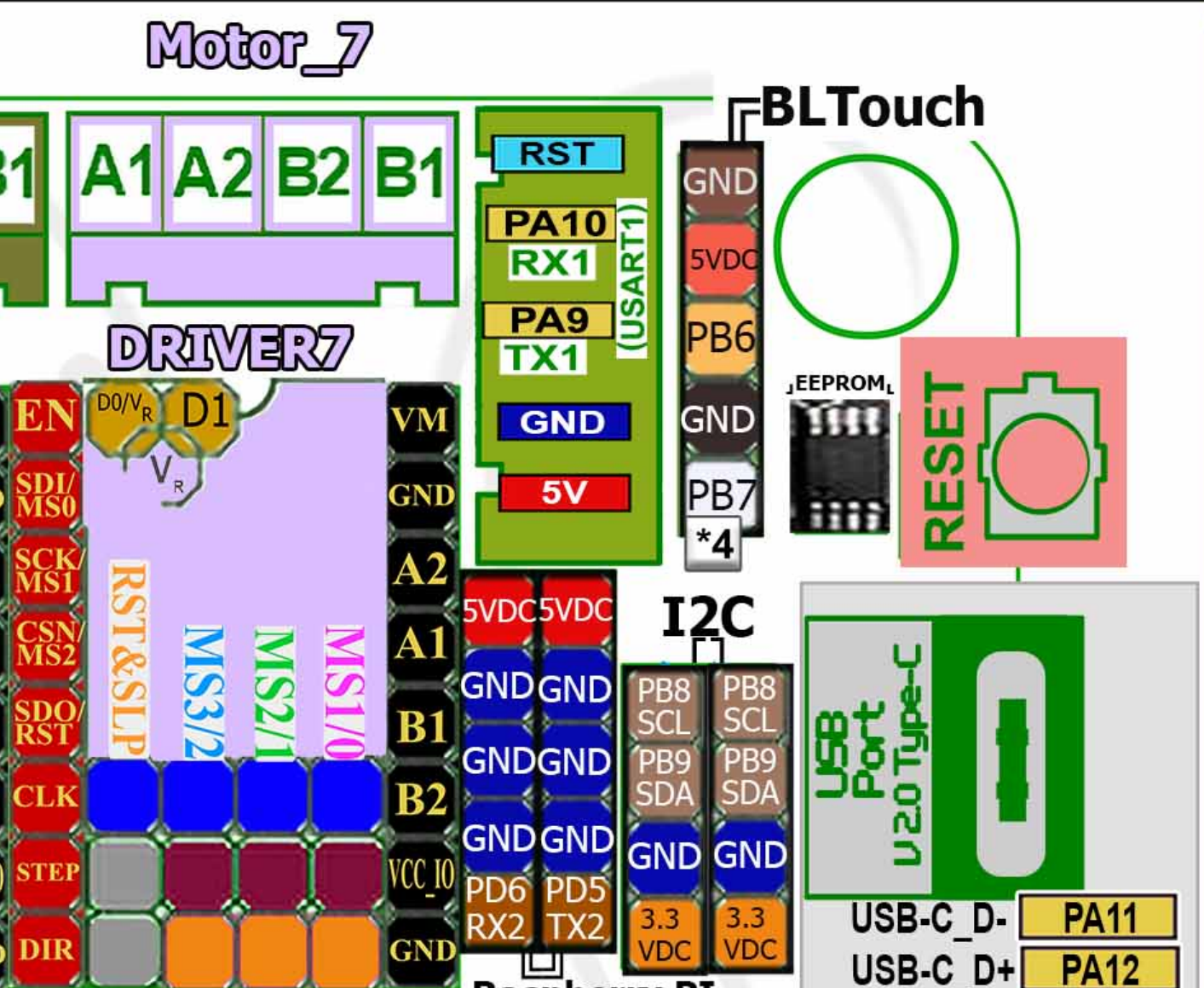 Octopus の基板上の RGBヘッダは Stealthburner が使うので、さらにストリップを追加しようと思うとなかなかピンが見当らない。BLTouch のところがあいてるなら使える。(PB6)