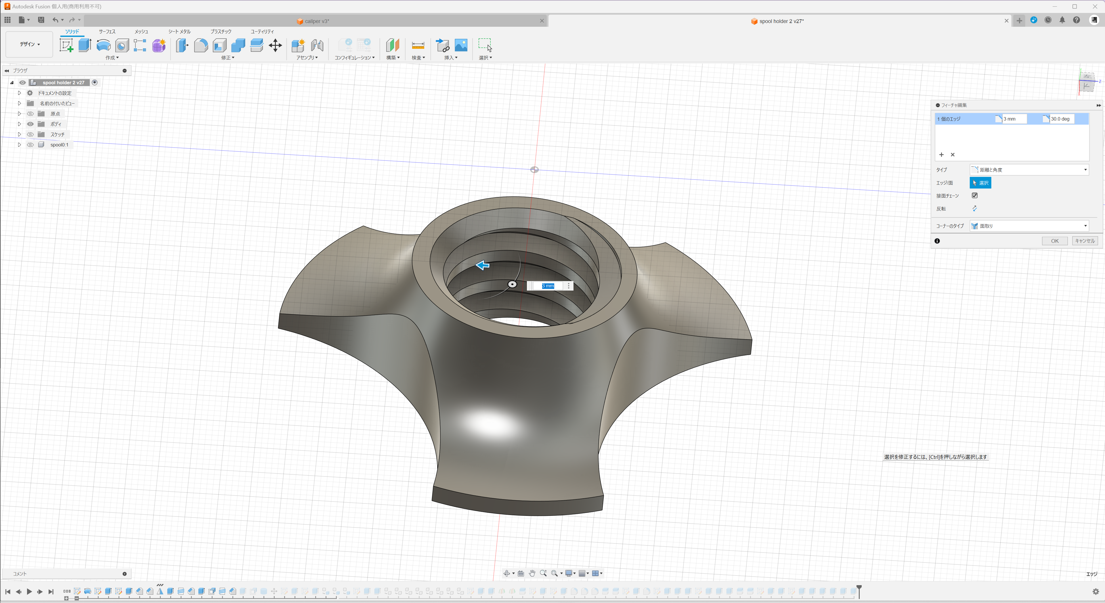 ところで Fusion360 だとねじの面取りがあまり直感的ではなく、先に穴に対して面取りをかけてからねじを作成し、面取りのフィーチャをねじの作成後に移動するという手順を踏まないといけない。