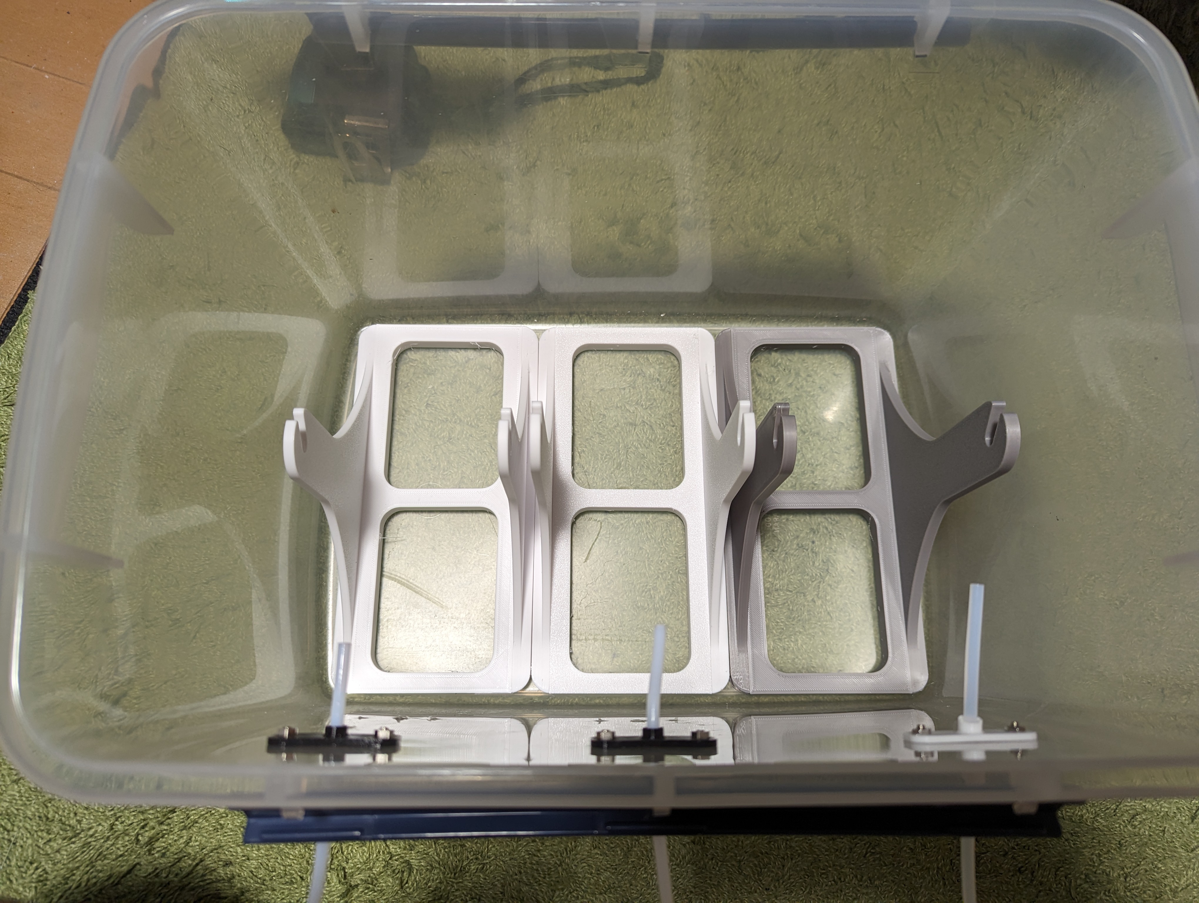 ボックス的にギリギリ3つのスプールが収められる感じなので、軸が干渉しないように工夫してある。軸の位置を、上下に若干ずらし斜めにすべらせて設定する構造に。